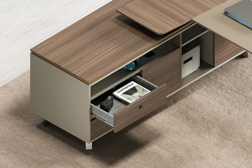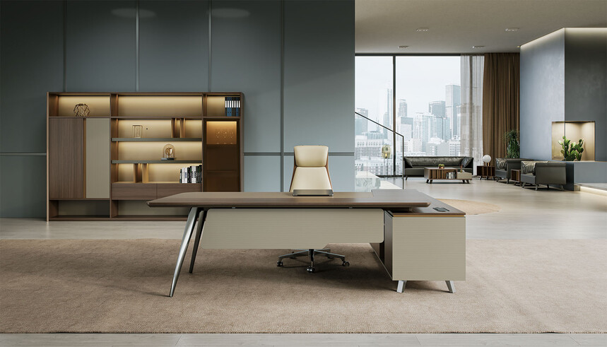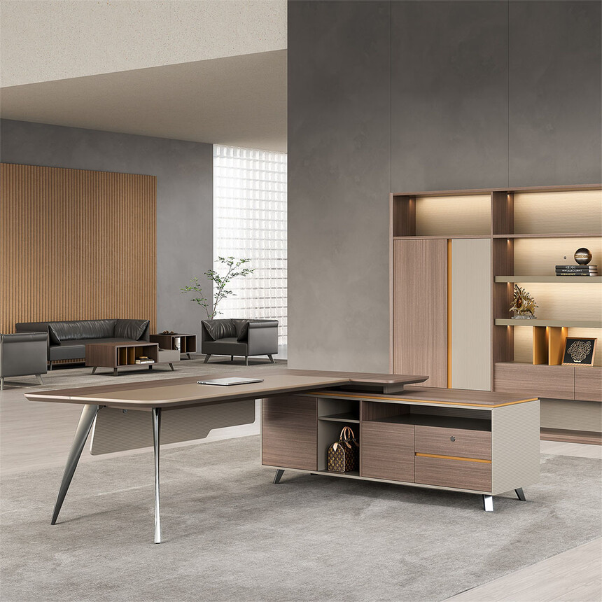 賓利系列產(chǎn)品外觀(guān)采用意式輕奢的設(shè)計(jì)風(fēng)格,主附臺(tái)面一體化,雙層面板,整體造型全方位的意式切割風(fēng)格,體現(xiàn)了產(chǎn)品造型的不對(duì)稱(chēng)美,主附配置大小八字鋼腳讓整個(gè)產(chǎn)品既有質(zhì)感又有美感,加上產(chǎn)品搭配爵士胡桃與條紋蘆灰的配色,充分體現(xiàn)產(chǎn)品高品位的氣質(zhì),是現(xiàn)代都市辦公空間最佳選擇之一。