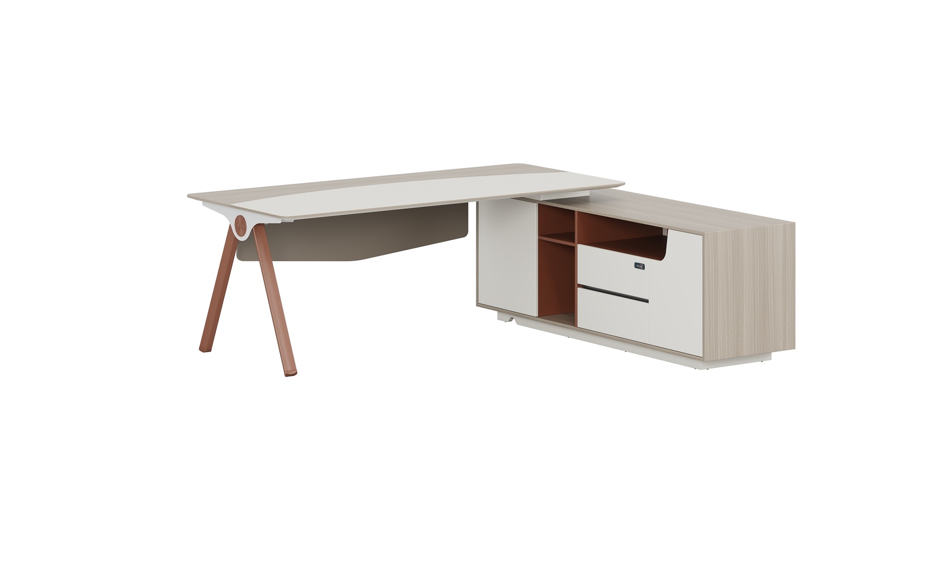 優(yōu)格又名“有格”,代表了有品格、有格調(diào)。產(chǎn)品整體以“青春、時尚、動感”為設(shè)計主題,采用了大量的弧形與直線條交叉設(shè)計,將產(chǎn)品魅力展示的淋漓盡致。在一貫沉穩(wěn)的深色辦公配色中,大膽運(yùn)用了白色、卡其棕色與淺色木紋的撞色搭配,打破產(chǎn)品配色原有的嚴(yán)肅氛圍,賦予了產(chǎn)品生命力以及活力。獨(dú)特的臺腳與桌屏設(shè)計,動感十足,無不展示產(chǎn)品的細(xì)節(jié)之美。產(chǎn)品設(shè)計時尚,配置齊全,適合各種規(guī)模的辦公場所。