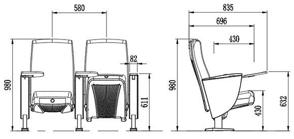 2.座椅基本中心距為580±10mm,座包打開側(cè)深696±10mm,寫字板打開側(cè)深835±10mm,基本椅高為980±10mm,最小排距:900mm。