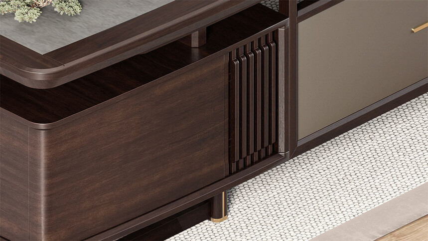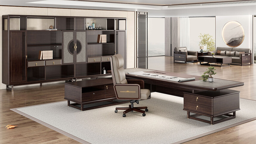 鴻泰系列是一款新中式風(fēng)格的辦公家具,設(shè)計(jì)靈感源于中式傳統(tǒng)裝飾紋樣“回”字形,因其形式回環(huán)反復(fù),延綿不斷,在民間有“富貴不斷頭”的說(shuō)法,有連綿不斷、吉利長(zhǎng)久的吉祥寓意,在造型上主要采用硬朗簡(jiǎn)潔的直線條,溫潤(rùn)的烏金木與質(zhì)樸的巖板相結(jié)合,剛?cè)岵?jì),時(shí)尚大方,既使得中式家具古典、質(zhì)樸的內(nèi)涵顯現(xiàn),又符合現(xiàn)代辦公追求的時(shí)尚感、實(shí)用性。